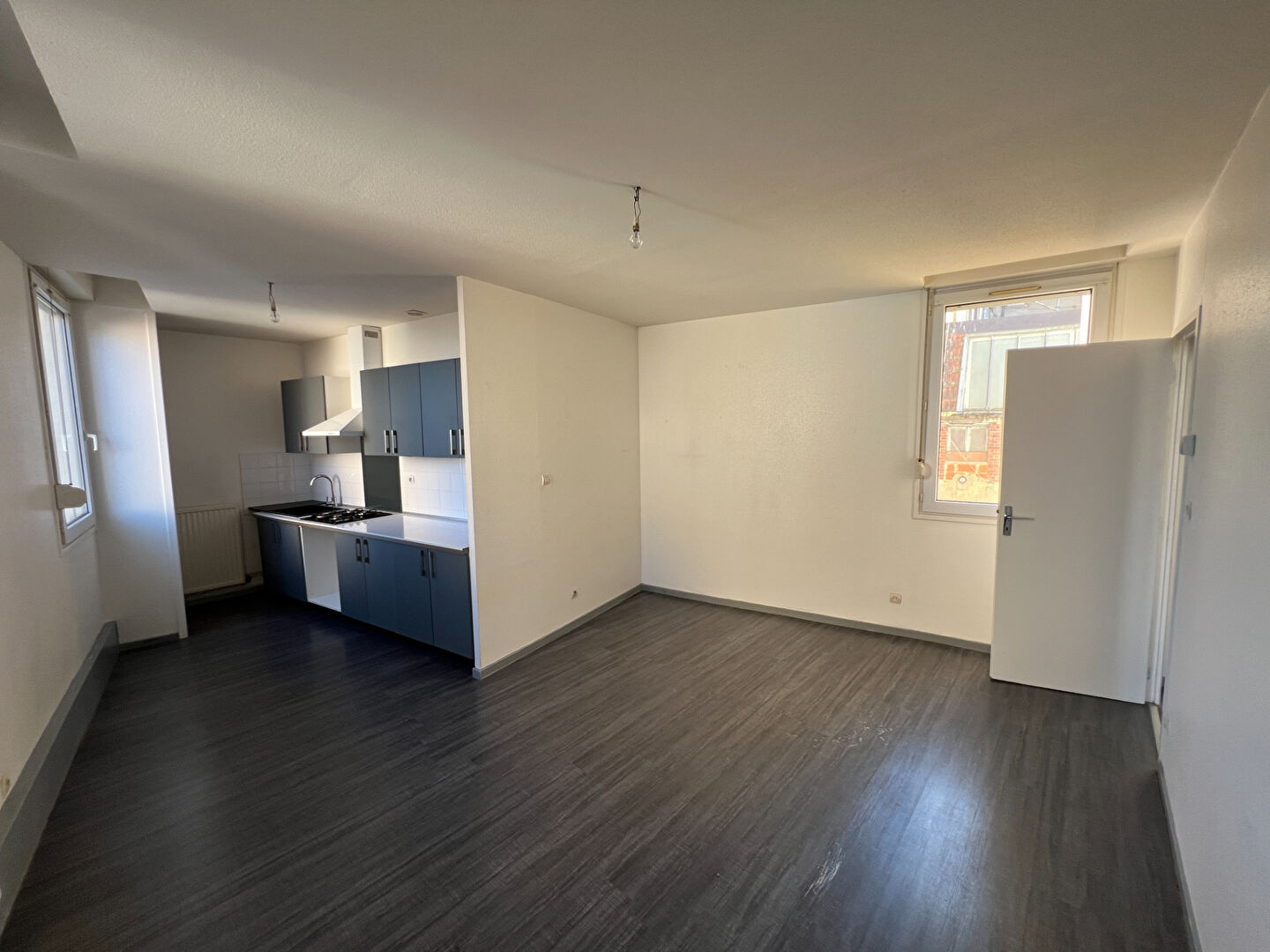 Une cuisine équipée, un séjour, une chambre, et une salle d'eau.