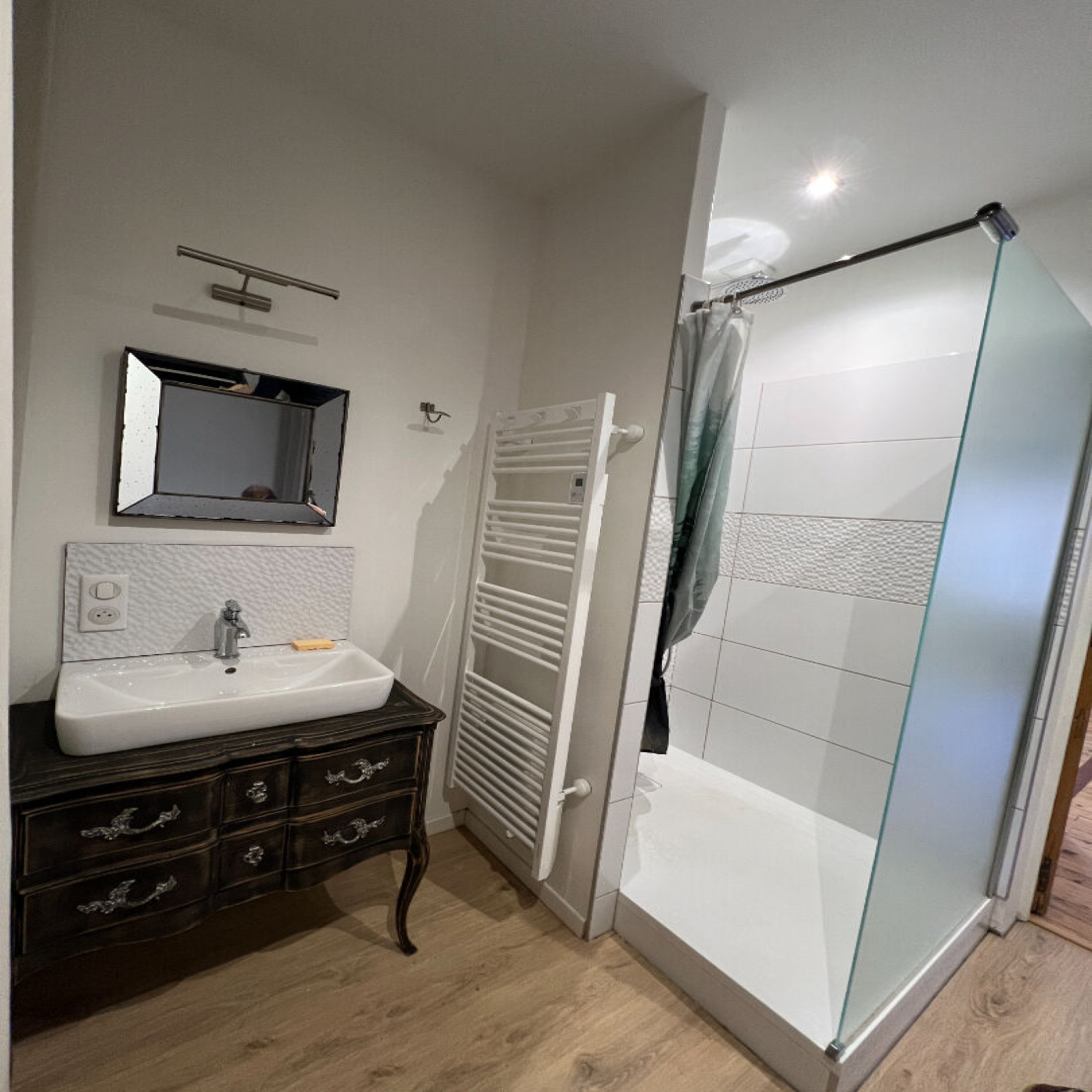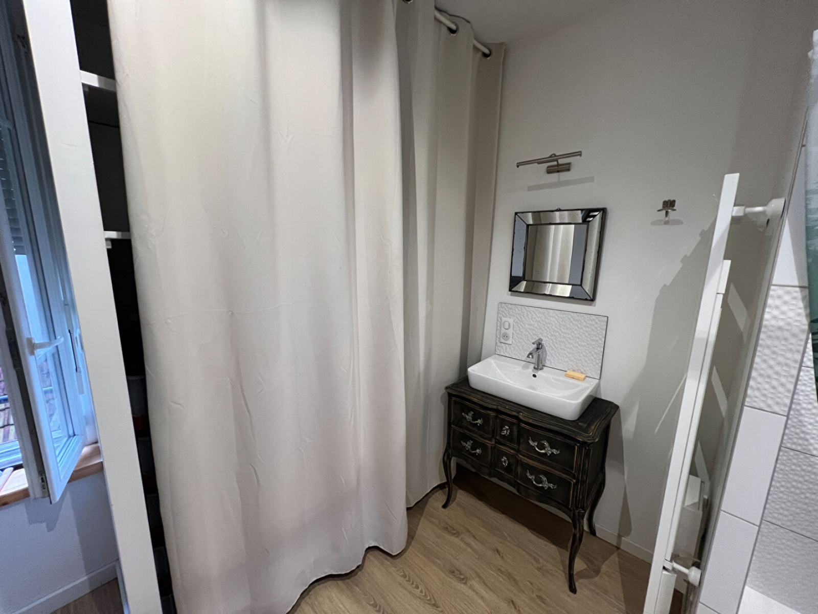 Une entrée, cuisine équipée et meublée ouverte sur séjour, une chambre avec salle d'eau.
